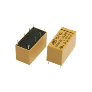 Relé HF46F/12-HS1 de 12V miniatura, con contactos SPST-NO de 5A. Compacto y confiable, ideal para montaje en PCB y control de cargas eléctricas.