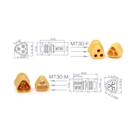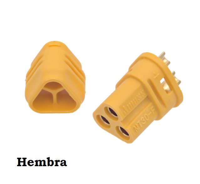 Conector MT30 Macho o Hembra es un conector de potencia de alta corriente diseñado para aplicaciones electrónicas donde se requiere una conexión compacta, segura y de baja resistencia. Este modelo es ampliamente utilizado en drones, vehículos RC y sistemas alimentados por baterías LiPo debido a su excelente desempeño eléctrico.