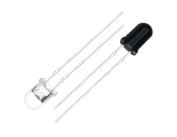 Los Diodo emisor y receptor infrarrojo de 3mm son par de LEDs infrarrojos compuesto por un fotodiodo (Emisor) que emite una luz infrarroja con una longitud de onda de 980nm cuando se polariza a través de sus rangos de tensión de trabajo y un fototransistor (Receptor) que permite captar la luz infrarroja emitida por el fotodiodo. Estos LEDs infrarrojos son de uso general y tienen un diámetro de 5mm.