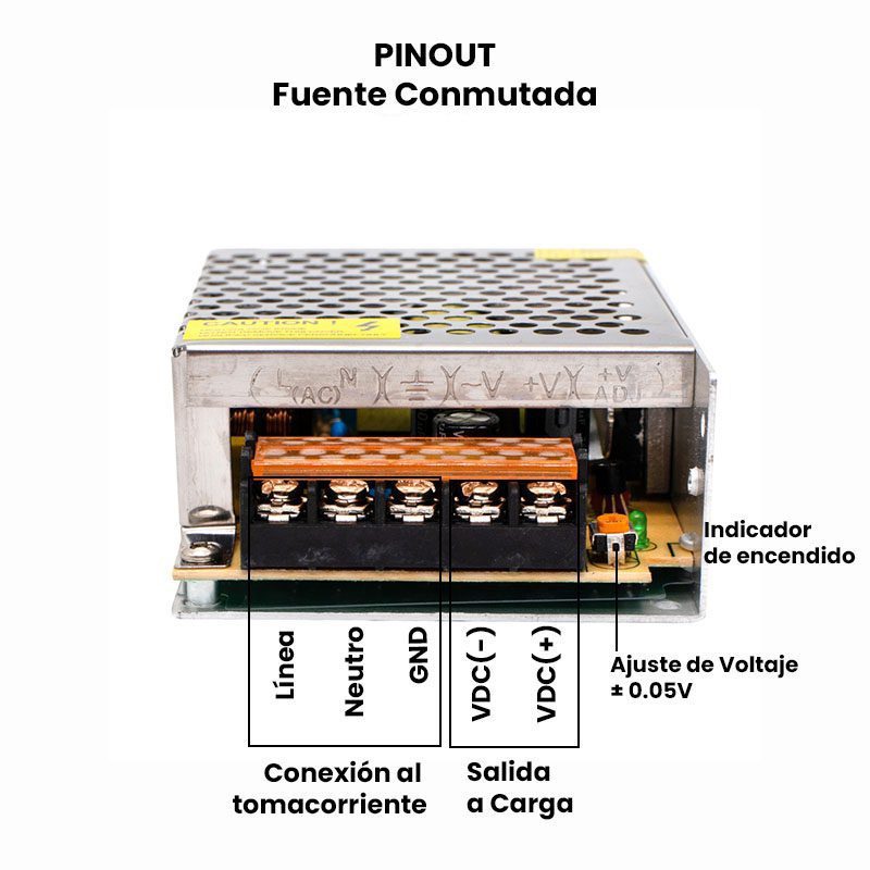 - Conexiones: Regleta para entrada AC y salida DC con ajuste de voltaje