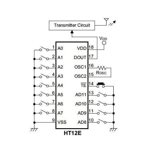 HT12E Encoder RF 12 Bits, codificador CMOS para transmisión inalámbrica en sistemas de control remoto RF e IR.