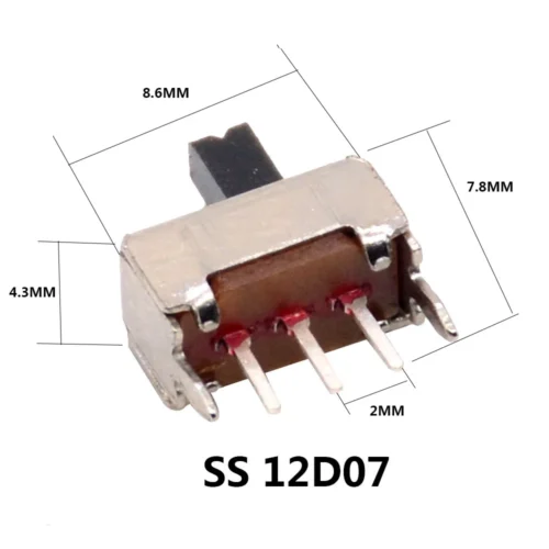Interruptor deslizante SS 12D07, Interruptor/conmutador deslizante o de palanca de 2 posiciones con una distancia entre pines de 2 mm, utilizado ampliamente para controlar la operación de proyectos electrónicos de encendido y apagado, ya que su diseño mecánico no permite la activación de los dos contactos al mismo instante de tiempo, logrando activar un contacto y desactivar el otro. Es también un gran componente para el bricolaje.