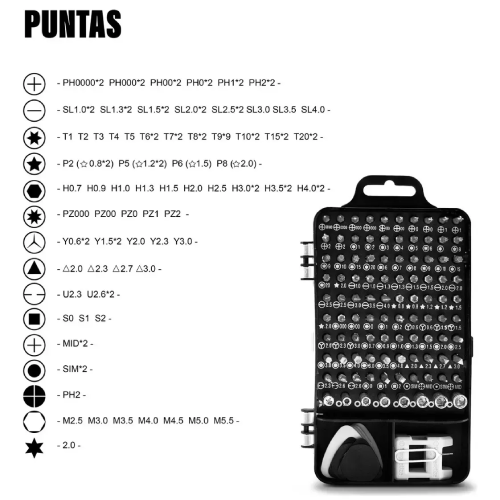 - Tipos de cabezas incluidas: Phillips, ranura (slotted), Torx, hexágono, pentalobe, entre otras