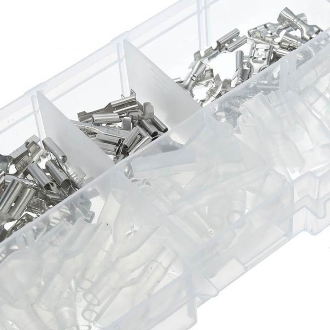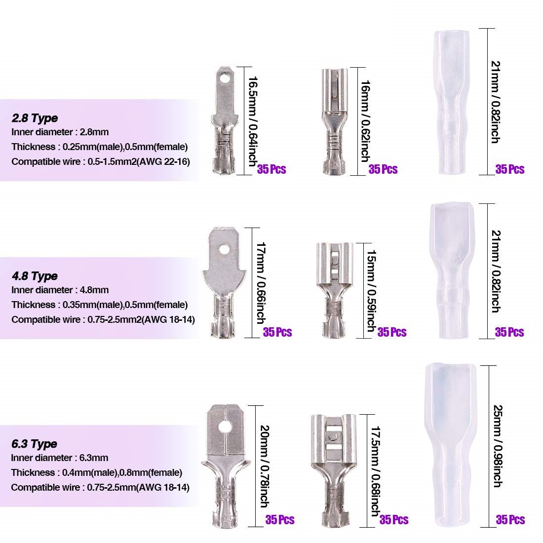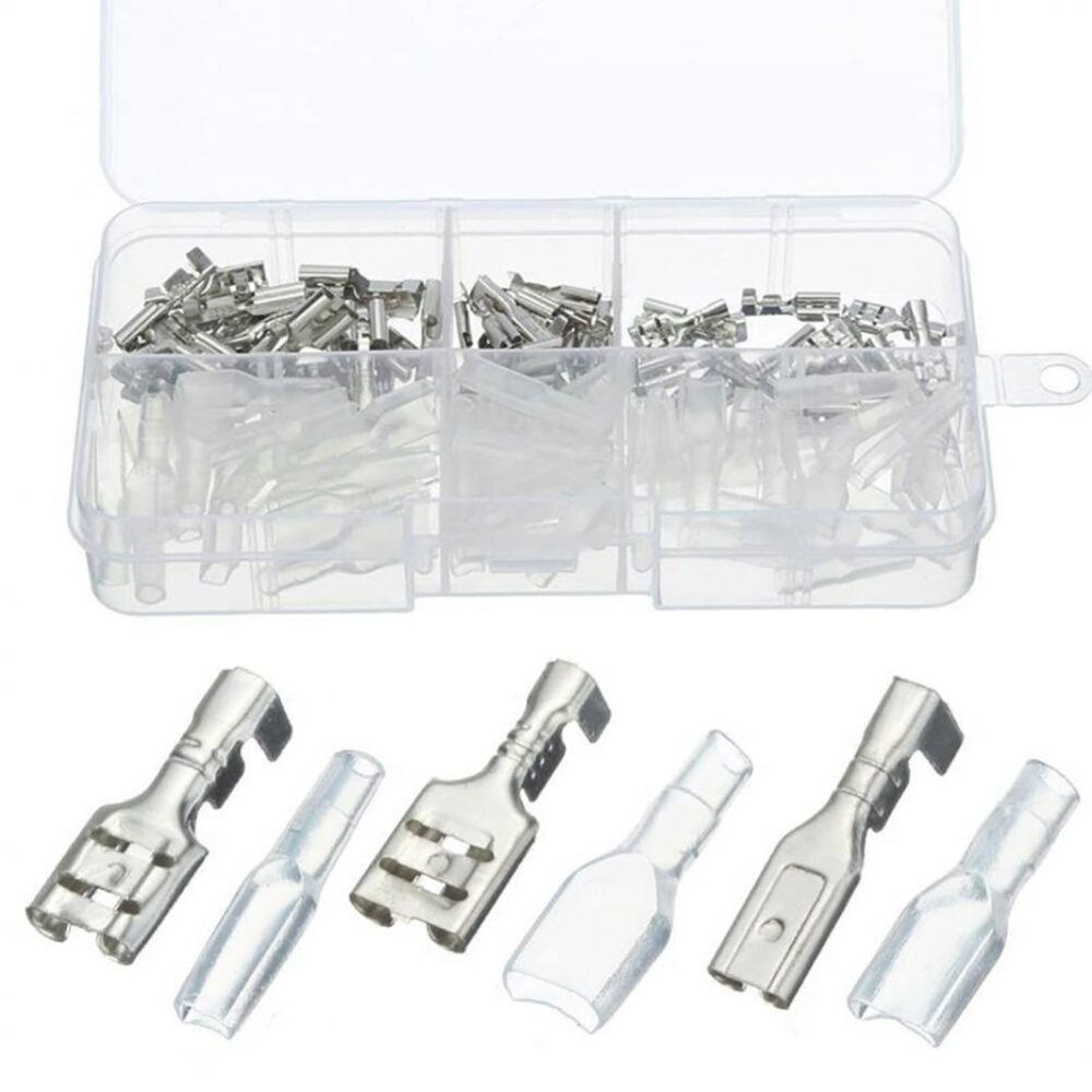El kit incluye terminales de pala hembra en tres tamaños: 2,8 mm, 4,8 mm y 6,3 mm, junto con mangas aislantes correspondientes. Esta variedad permite adaptarse a distintos calibres de cable, facilitando la instalación y asegurando una conexión sólida.