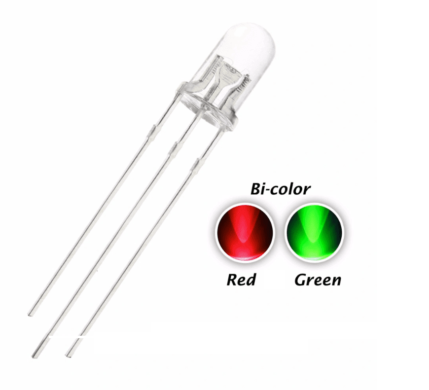 El LED Bicolor Cátodo Común 5mm combina rojo y verde en un solo encapsulado, ofreciendo alta luminosidad y bajo consumo, ideal para señalización electrónica.