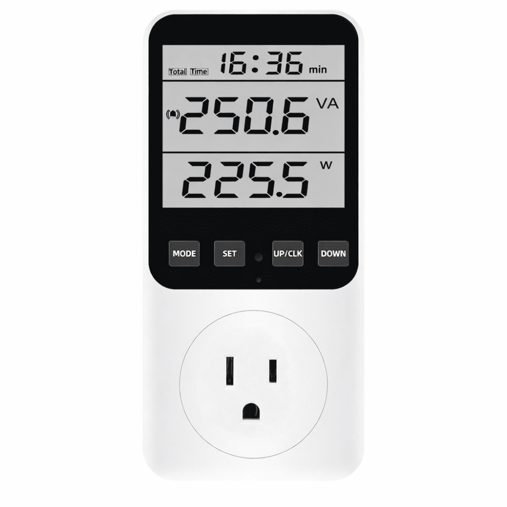 Vatímetro digital con enchufe US para medir consumo eléctrico, potencia y energía en sistemas de corriente alterna.