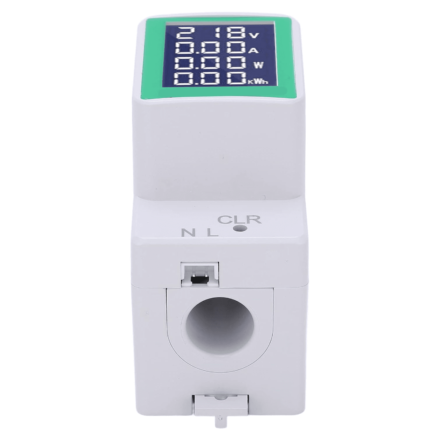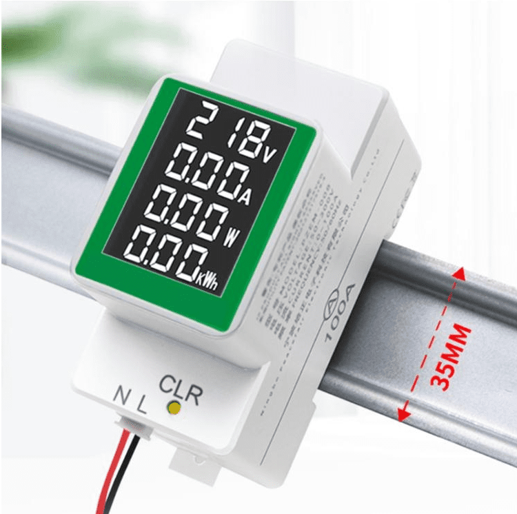 Este medidor soporta un rango de voltaje de 50 V a 300 V AC y una corriente de hasta 100 A, utilizando un transformador de corriente externo para una medición segura y confiable. Su formato para montaje en riel DIN facilita la instalación en tableros eléctricos, cuadros de distribución y sistemas de control.