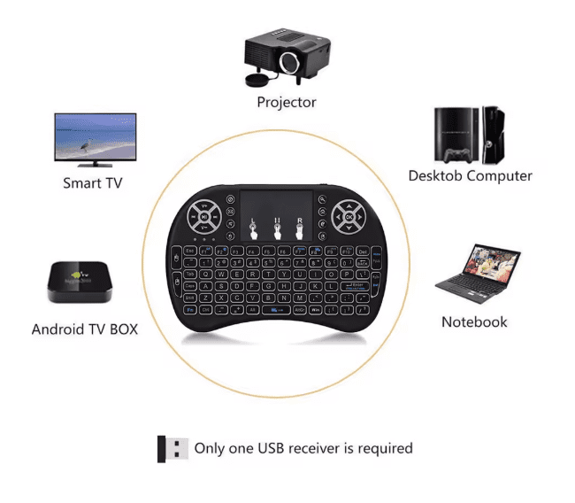 Funciona mediante conexión inalámbrica de 2.4 GHz a través de un receptor USB, ofreciendo una comunicación estable y de bajo retardo. Su retroiluminación facilita el uso en entornos con poca luz. Es compatible con múltiples plataformas, lo que lo convierte en una solución práctica para centros multimedia, Smart TV, TV Box, computadoras y proyectos de automatización.