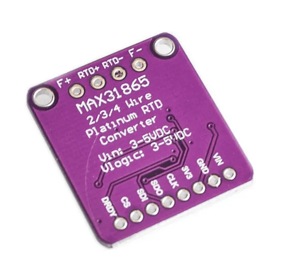 El MAX31865 maneja todas las necesidades de un RTD, e incluso puede compensar RTDs de 3 o 4 hilos para una mayor precisión. Puede conectar a él cualquier microcontrolador con protocolo SPI y leer la relación de resistencia del ADC interno. Ponemos una resistencia de 4300Ω 0,1% como una resistencia de referencia en la ruptura.