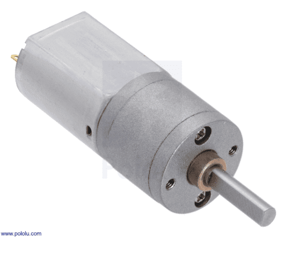 Motorreductor Original Pololu item # 3702 de CC con escobillas pueden ofrecer mucha potencia para su tamaño. Esta versión tiene un motor de CC con escobillas de 6 V con escobillas de carbón de larga duración combinado con una caja de cambios de metal de 63:1 . El motorreductor es cilíndrico con un diámetro de 20 mm y el eje de salida en forma de D tiene 4 mm de diámetro y se extiende 18 mm desde la placa frontal de la caja de cambios.