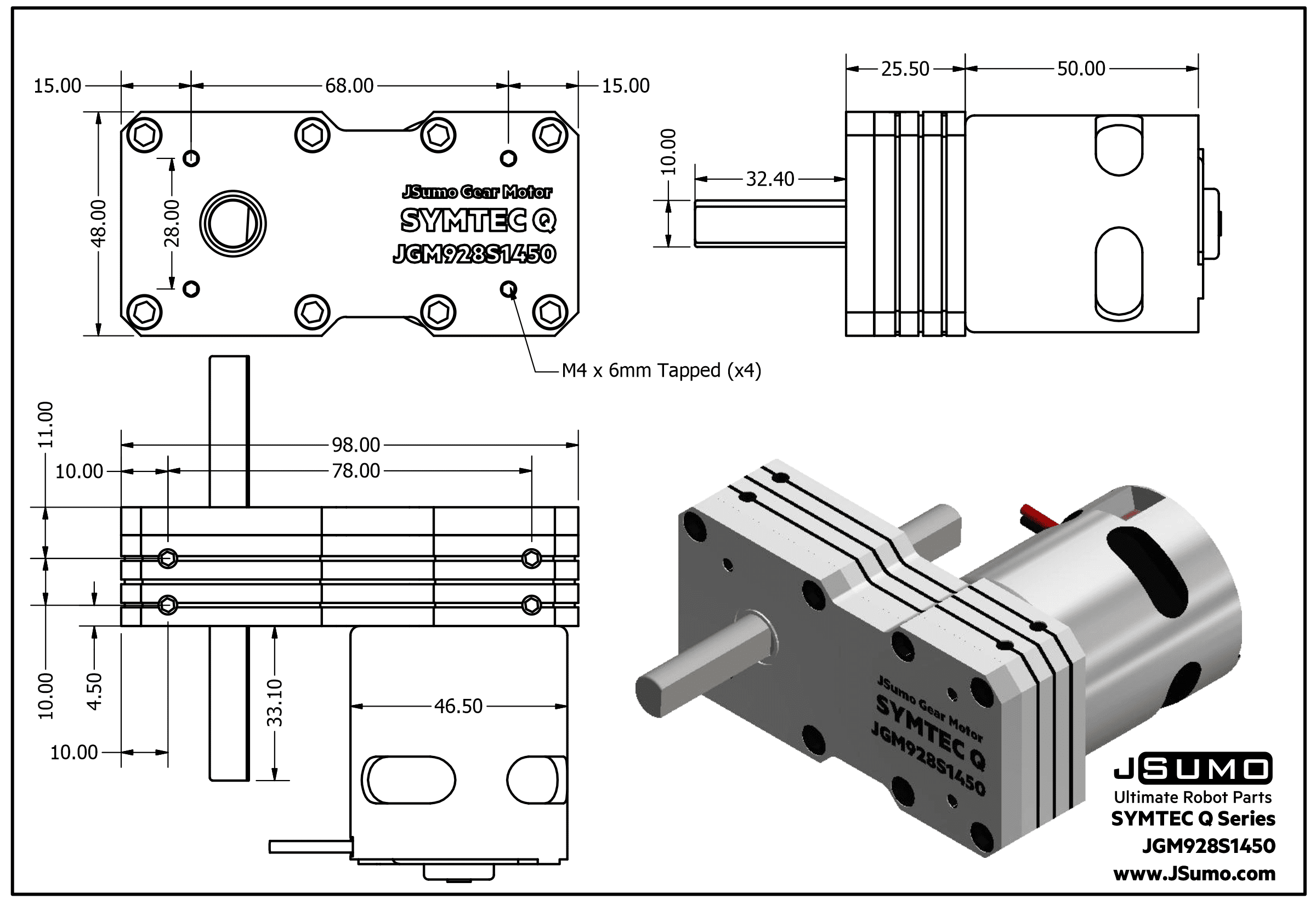 - Dimensiones: 98 × 48 × 25.5 mm (reductor) / Ø45 × 40 mm (motor)