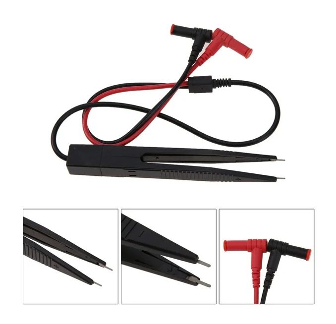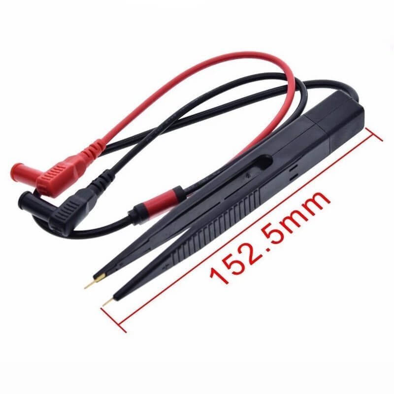 Pinza antiestática SMD tipo test clip diseñada para mediciones precisas con multímetro en componentes de montaje superficial.