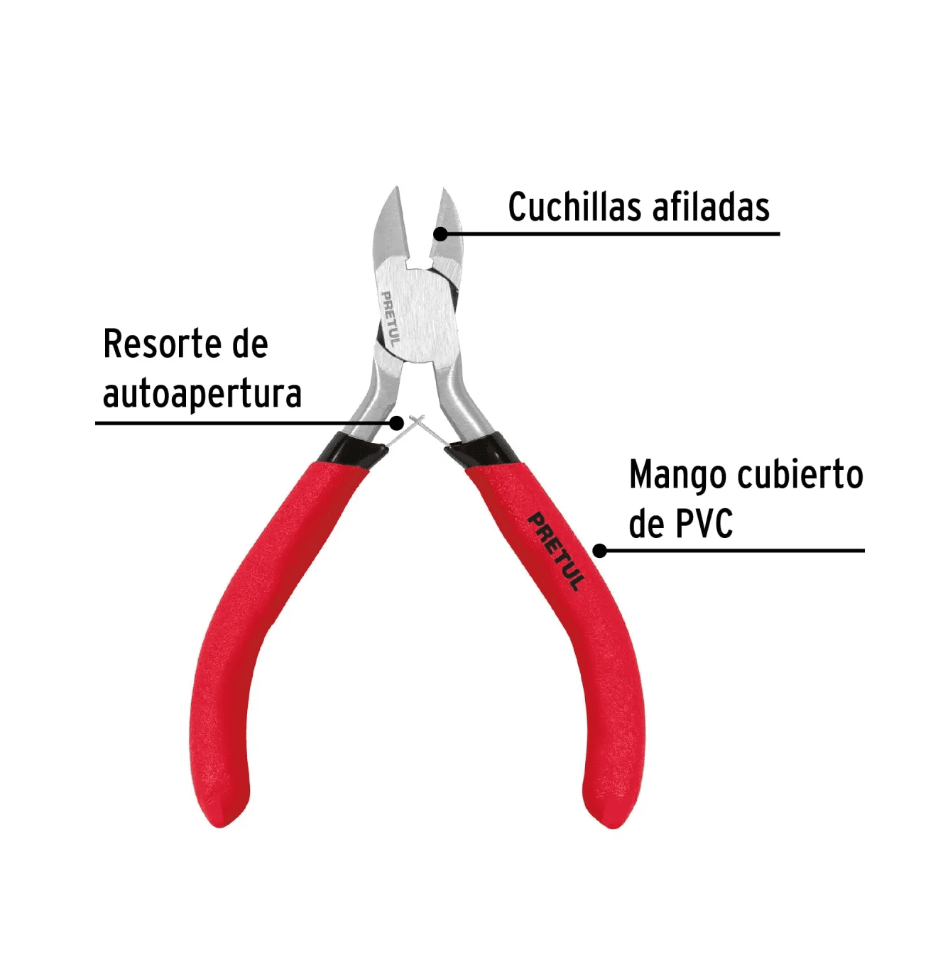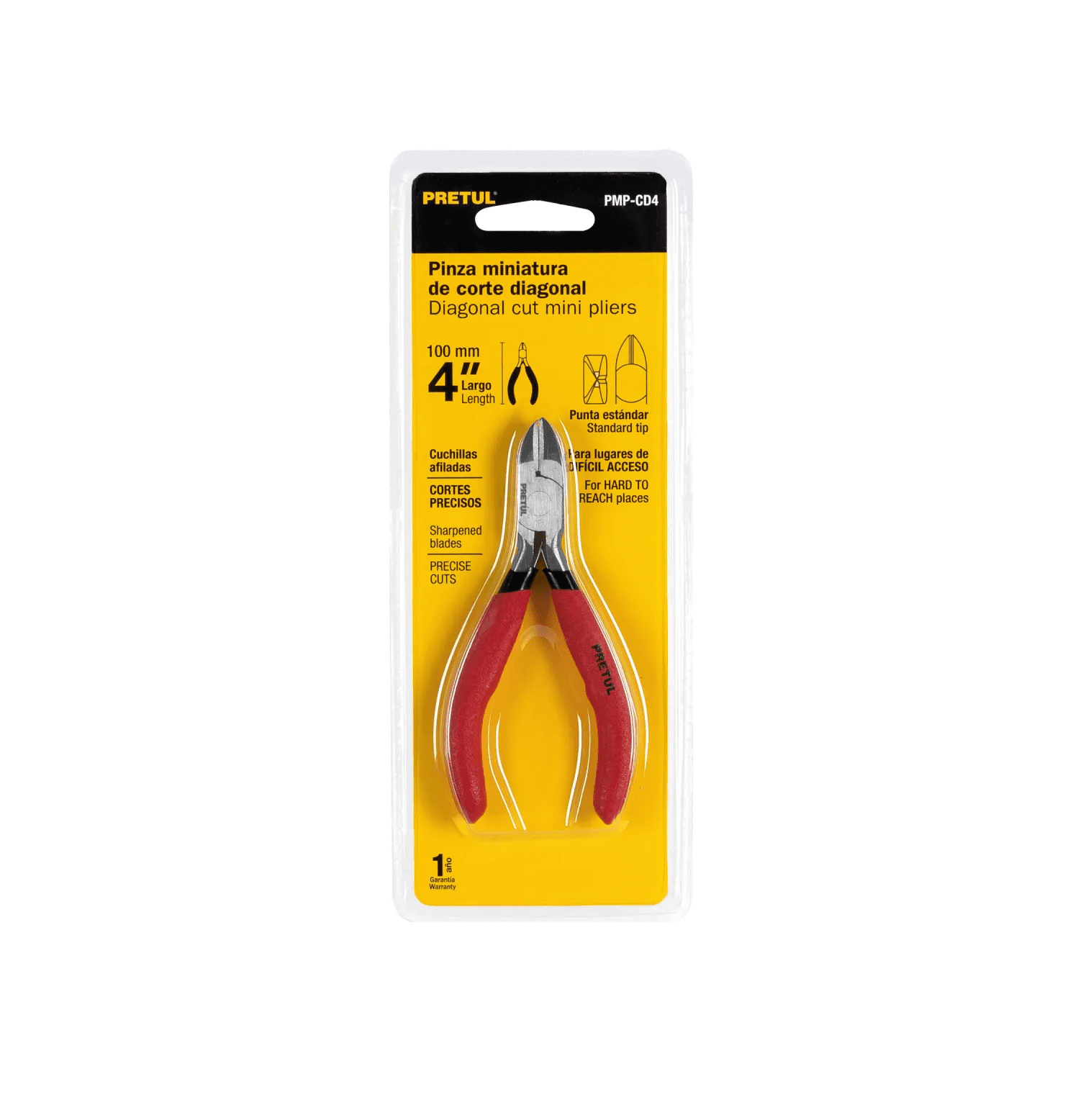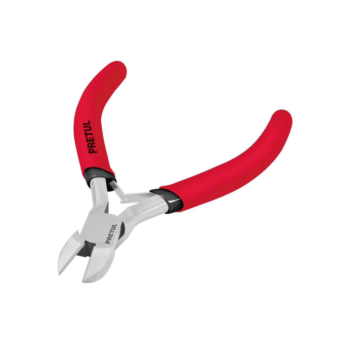 Gracias a su tamaño compacto de 4 pulgadas (100 mm), la Pinza miniatura corte diagonal PRETUL permite alcanzar espacios reducidos con gran comodidad. Sus filos están templados y afilados con precisión para realizar cortes limpios en cables finos, hilos de cobre, alambres de estaño o componentes electrónicos. Además, facilita el uso prolongado reduciendo la fatiga en la mano.