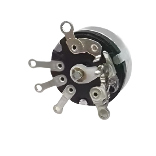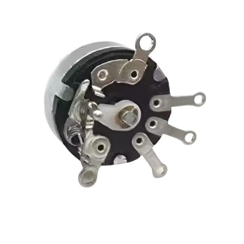 Potenciómetro de conmutación rotativa con interruptor diseñado para ajustar niveles de voltaje o intensidad en circuitos electrónicos con precisión. Este componente combina las funciones de un potenciómetro convencional con un interruptor integrado, lo que permite controlar y desconectar la alimentación desde un solo dispositivo, brindando comodidad y eficiencia.