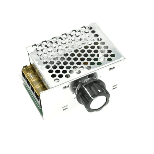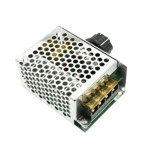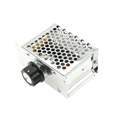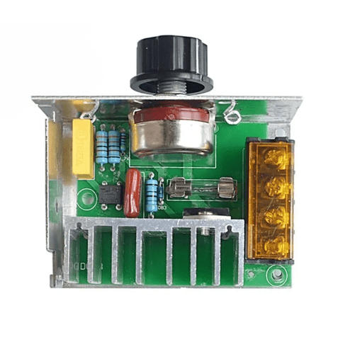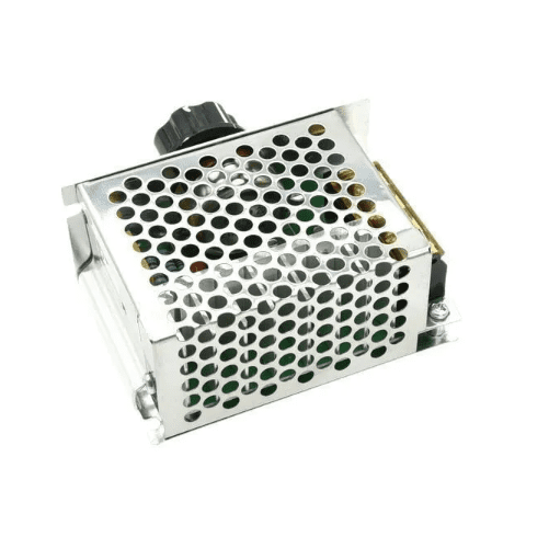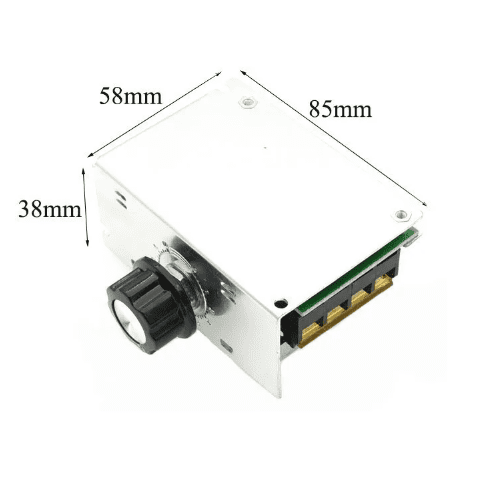 Regulador de potencia dimmer 4000W conocido como SCR. Este se usa principalmente para cargas resistivas como cables eléctricos incandescentes, etc. Este puede regular el voltaje para controlar la mayoría de motores de Corriente Alterna (AC) monofásico. El regulador o controlador tiristor incluye un fusible de protección, pero está destinado a proteger de cortos instantáneos, pero si el problema es que la corriente es demasiado grande, el fusible no se quemará de inmediato, sino que tendrá un tiempo de funcionamiento o aguante que podría terminar no solo en la quema del fusible, sino que el módulo también puede quemarse.