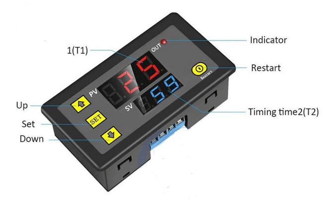 - Indicadores LED para confirmación de tiempos y estado del relé.
