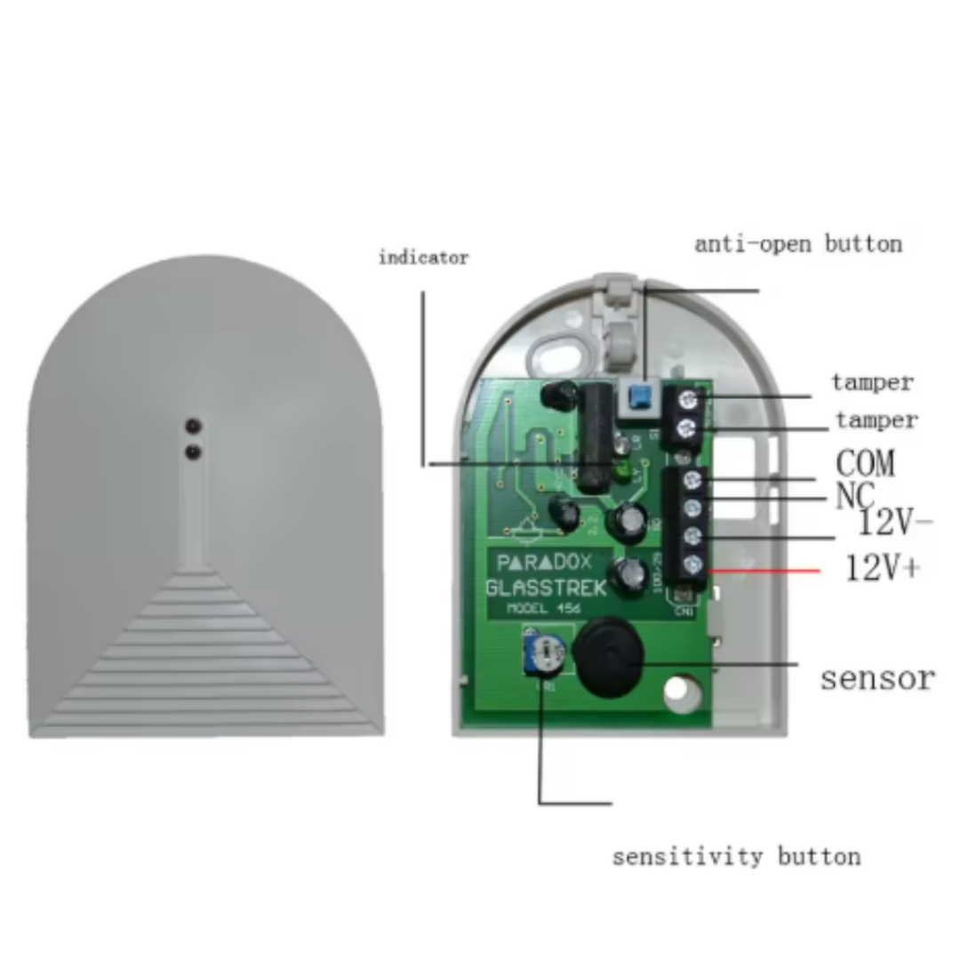 Sensor detector de vidrio roto diseñado para ofrecer protección avanzada en sistemas de alarma. Este dispositivo detecta el sonido característico de cristales rompiéndose y activa la alarma para garantizar la seguridad de viviendas, oficinas, comercios y espacios industriales.