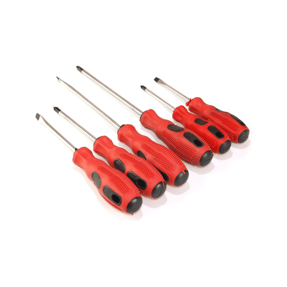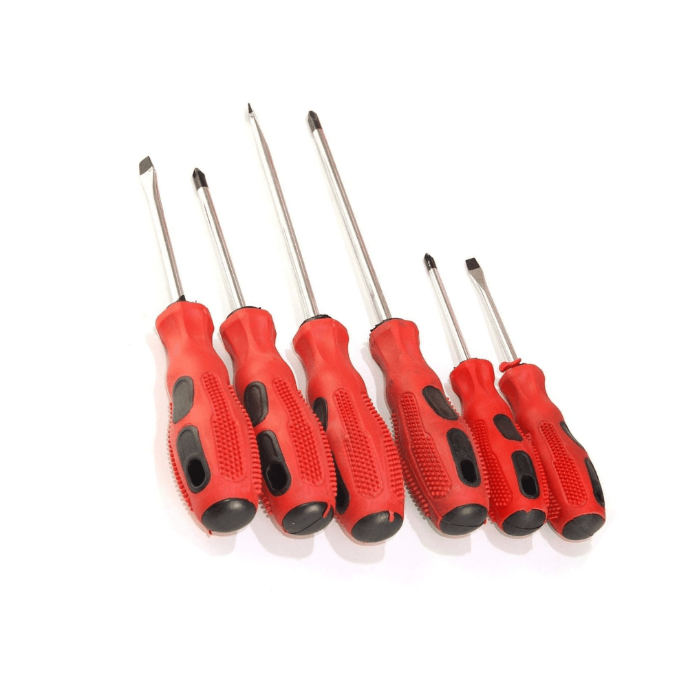 Set de 6 destornilladores rojos con negro, diseñado para ofrecer comodidad, precisión y durabilidad en trabajos de reparación, montaje y mantenimiento. Este set combina funcionalidad y estética, siendo una herramienta práctica y visualmente atractiva para cualquier caja de herramientas.