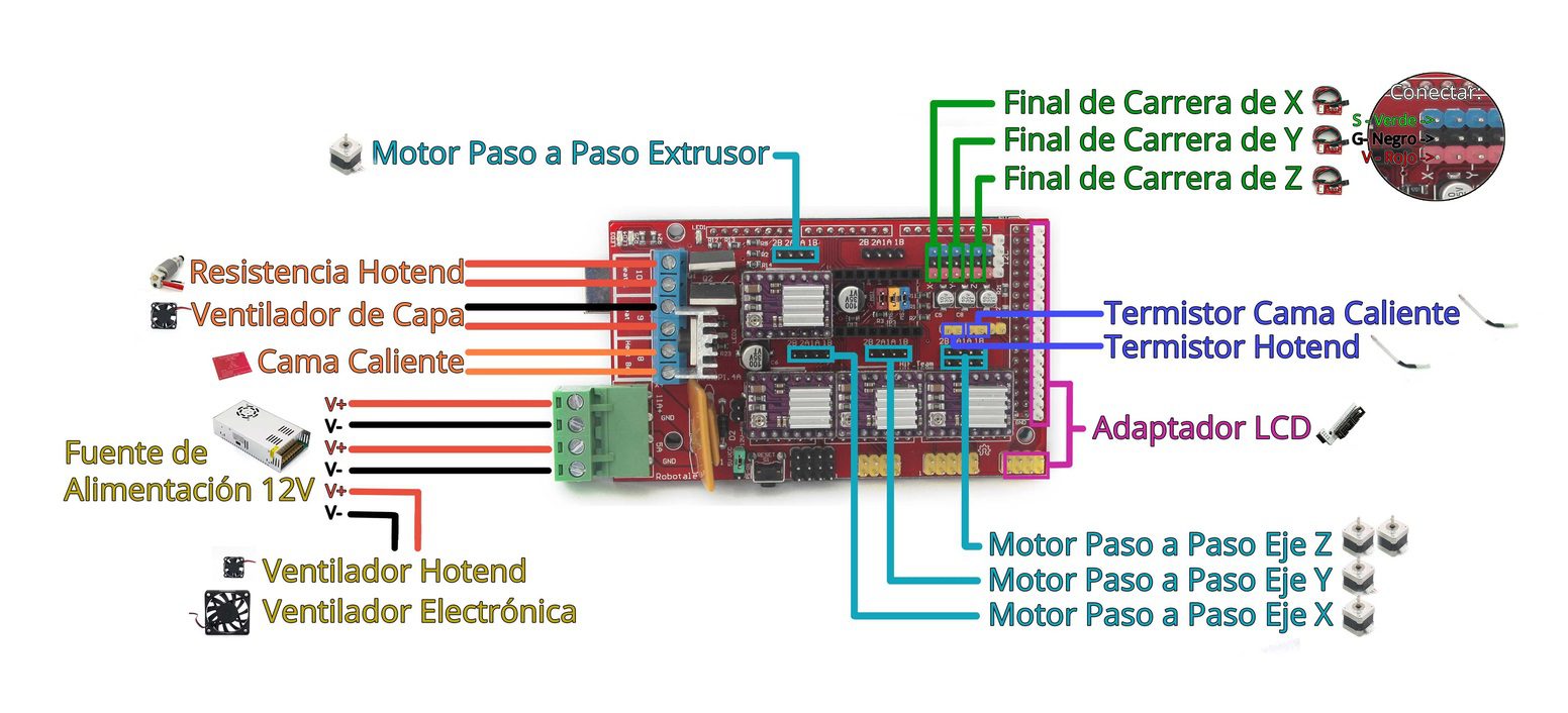 Cuenta con conectores para termistores, salidas MOSFET para cama caliente y extrusor, así como entradas para finales de carrera mecánicos u ópticos. Además, soporta alimentación externa de 12V o 24V según configuración, garantizando potencia suficiente para aplicaciones de impresión 3D estándar.