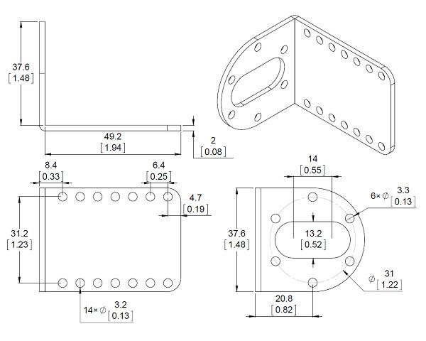 Estos soportes ligeros están diseñados específicamente para motorreductores metálicos 37D mm de Pololu. Cada soporte tiene catorce orificios de montaje (siete a lo largo de cada borde) para tornillos de tamaño M3, que le da una variedad de opciones de montaje. Se incluye un total de doce tornillos M3 de 5 mm (seis para cada soporte) para fijar los motores a los soportes.