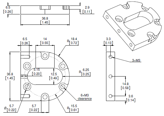 - Montaje versátil: El soporte incluye tres orificios roscados M3 en la parte inferior, que permiten fijarlo fácilmente a una superficie. Estos orificios están espaciados a 14.8 mm (0.58″), lo que proporciona flexibilidad en las opciones de montaje.