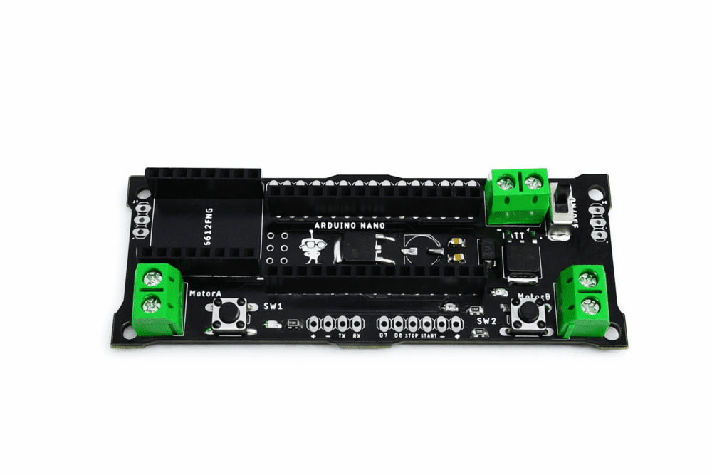 En primer lugar, la Tarjeta Minisumo SumoBot incorpora un microcontrolador Arduino Nano, lo que permite programar el robot de forma rápida y flexible mediante el entorno Arduino IDE. Esto resulta ideal tanto para estudiantes como para desarrolladores experimentados, ya que facilita la implementación de algoritmos de detección, control de movimiento y estrategia de combate.