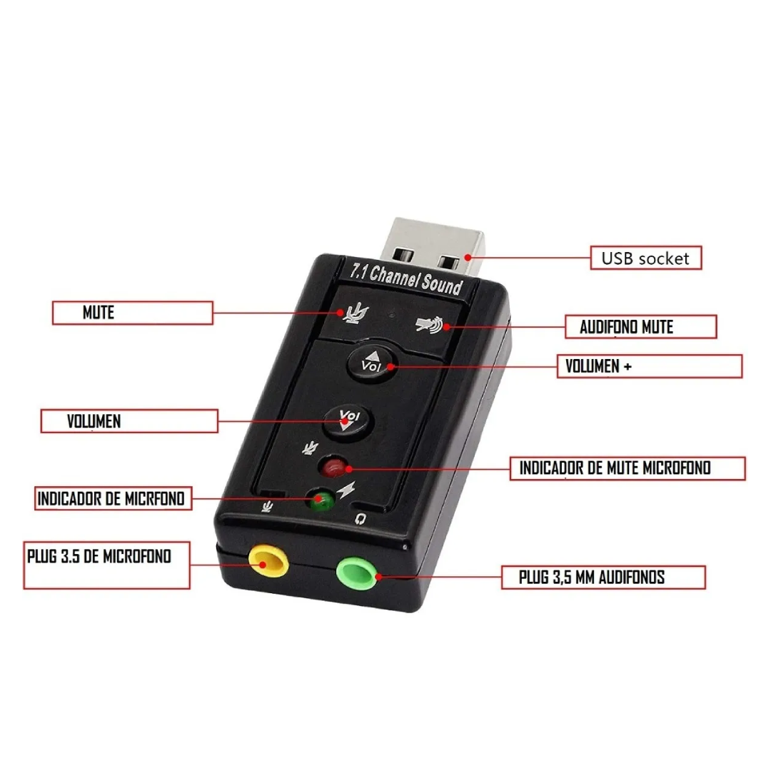 Fabricada con materiales resistentes y componentes electrónicos de alta calidad, esta tarjeta de sonido garantiza una transmisión de audio limpia y estable. Es compatible con USB 1.0, 1.1 y 2.0, y no requiere controladores ni instalación adicional: simplemente conéctala al puerto USB y estará lista para usar.
