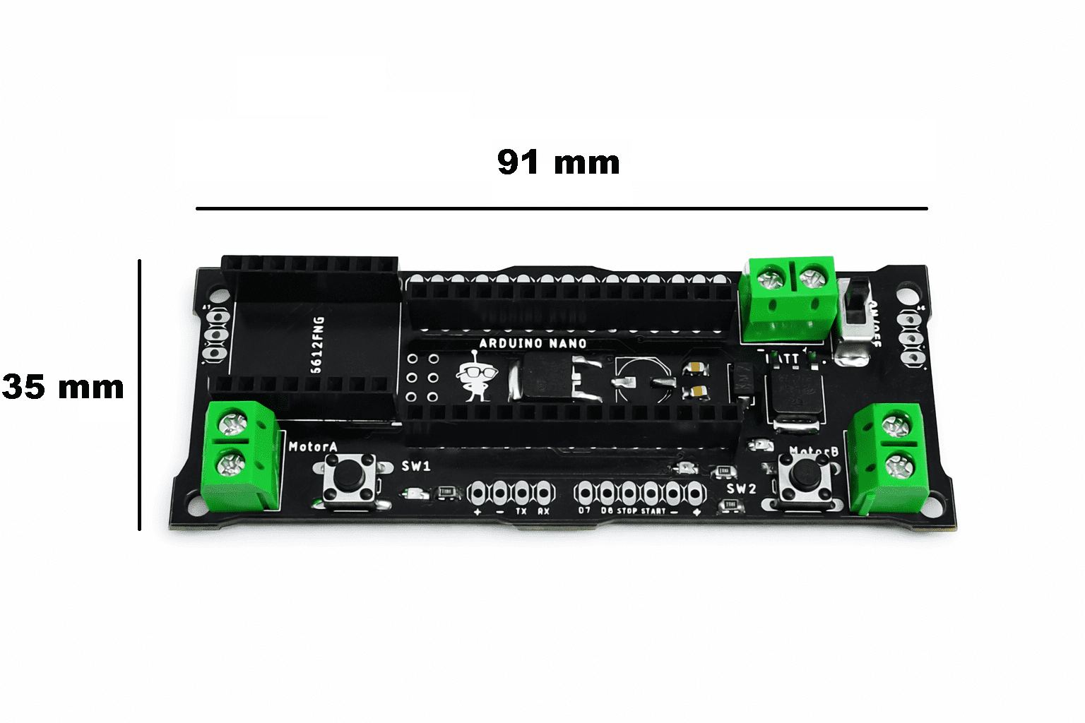 En primer lugar, la Tarjeta Minisumo SumoBot incorpora un microcontrolador Arduino Nano, lo que permite programar el robot de forma rápida y flexible mediante el entorno Arduino IDE. Esto resulta ideal tanto para estudiantes como para desarrolladores experimentados, ya que facilita la implementación de algoritmos de detección, control de movimiento y estrategia de combate.