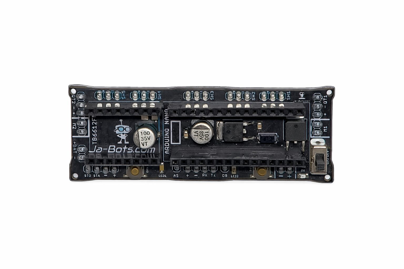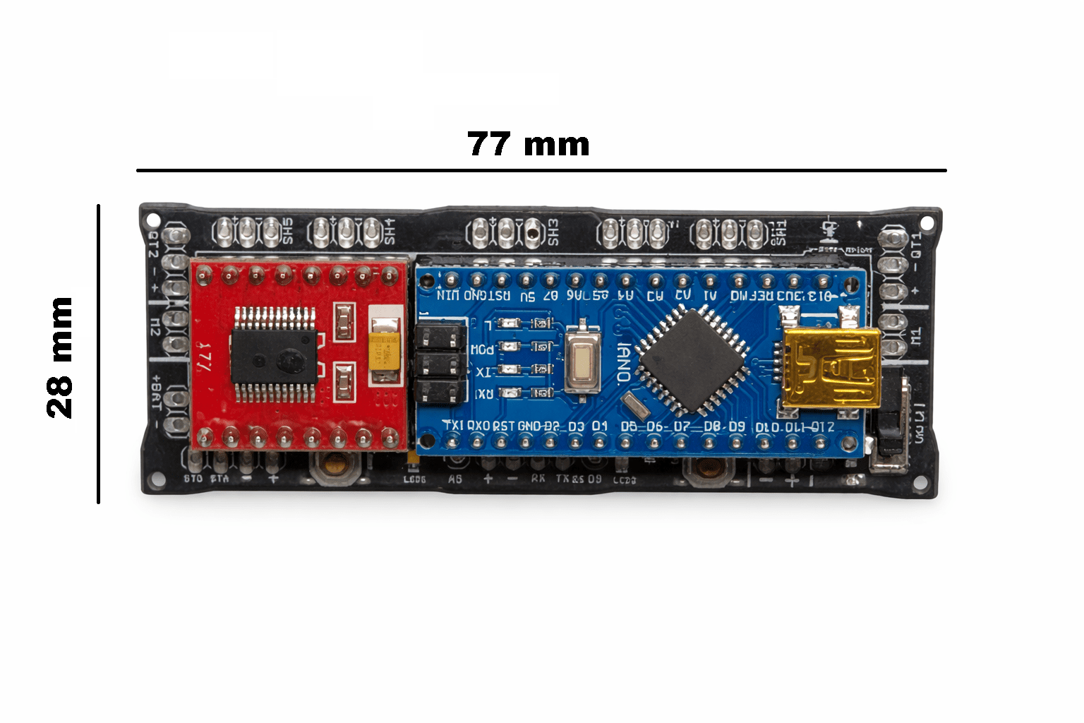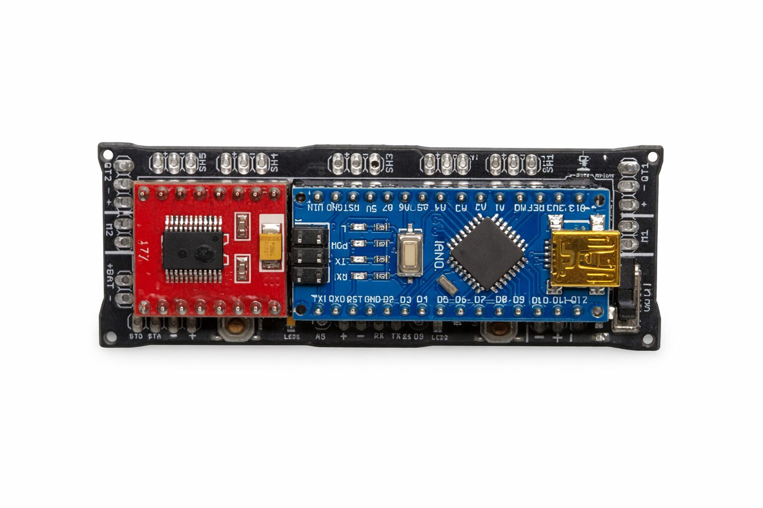En primer lugar, la Tarjeta Minisumo SumoBot incorpora un microcontrolador Arduino Nano, lo que permite programar el robot de forma rápida y flexible mediante el entorno Arduino IDE. Esto resulta ideal tanto para estudiantes como para desarrolladores experimentados, ya que facilita la implementación de algoritmos de detección, control de movimiento y estrategia de combate.