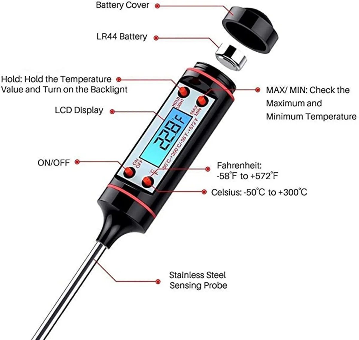 Este termómetro cuenta con función de apagado automático a los 10 minutos, lo que optimiza el consumo de energía. Funciona con una pila de botón AG13 (no incluida) y dispone de una pantalla digital de fácil lectura.