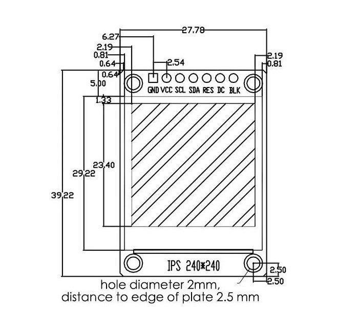 Con un tamaño físico de 27.5 x 39 mm y un área visible de 23.4 x 23.4 mm, este módulo es perfecto para aplicaciones de robótica, IoT, sistemas embebidos y visualización de sensores. Además, cuenta con pines claramente definidos (GND, VCC, SCL, SDA, RES, DC, BLK) para una integración sencilla.