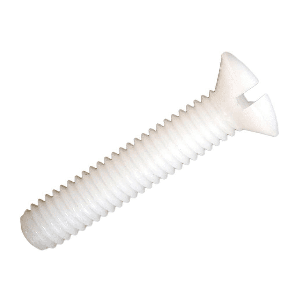 Tornillo avellanado de nailon M3×10 blanco, duradero y no conductor, para montaje y fijaciones ligeras.