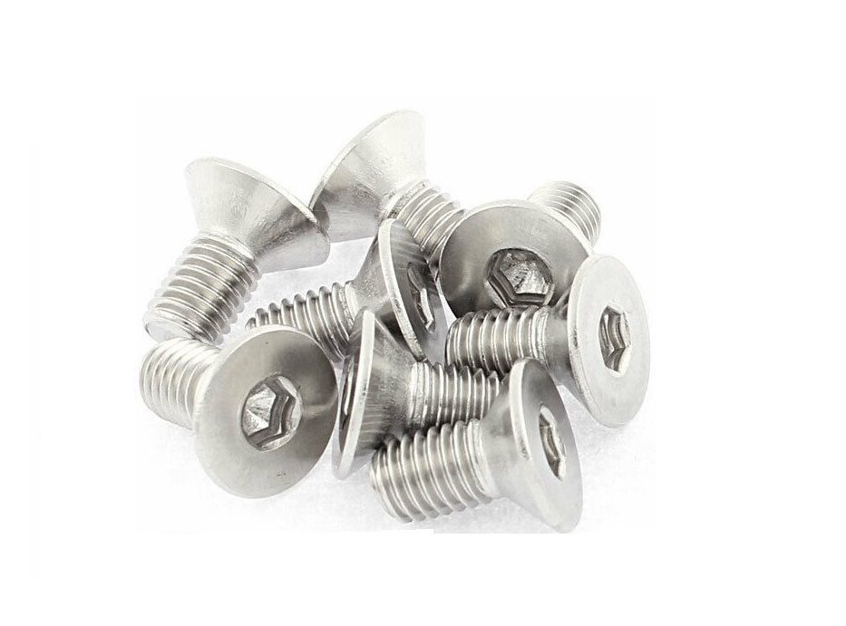 Paquete de 10 tornillos M8 cabeza plana hexagonal de acero inoxidable. Alta resistencia y durabilidad con acabado plateado. Perfectos para proyectos mecánicos e industriales.